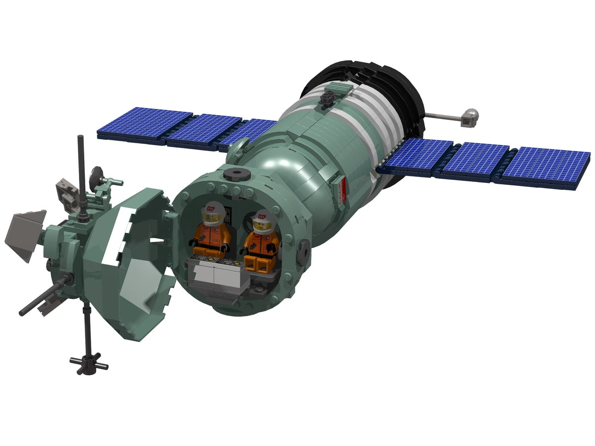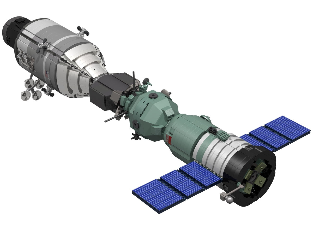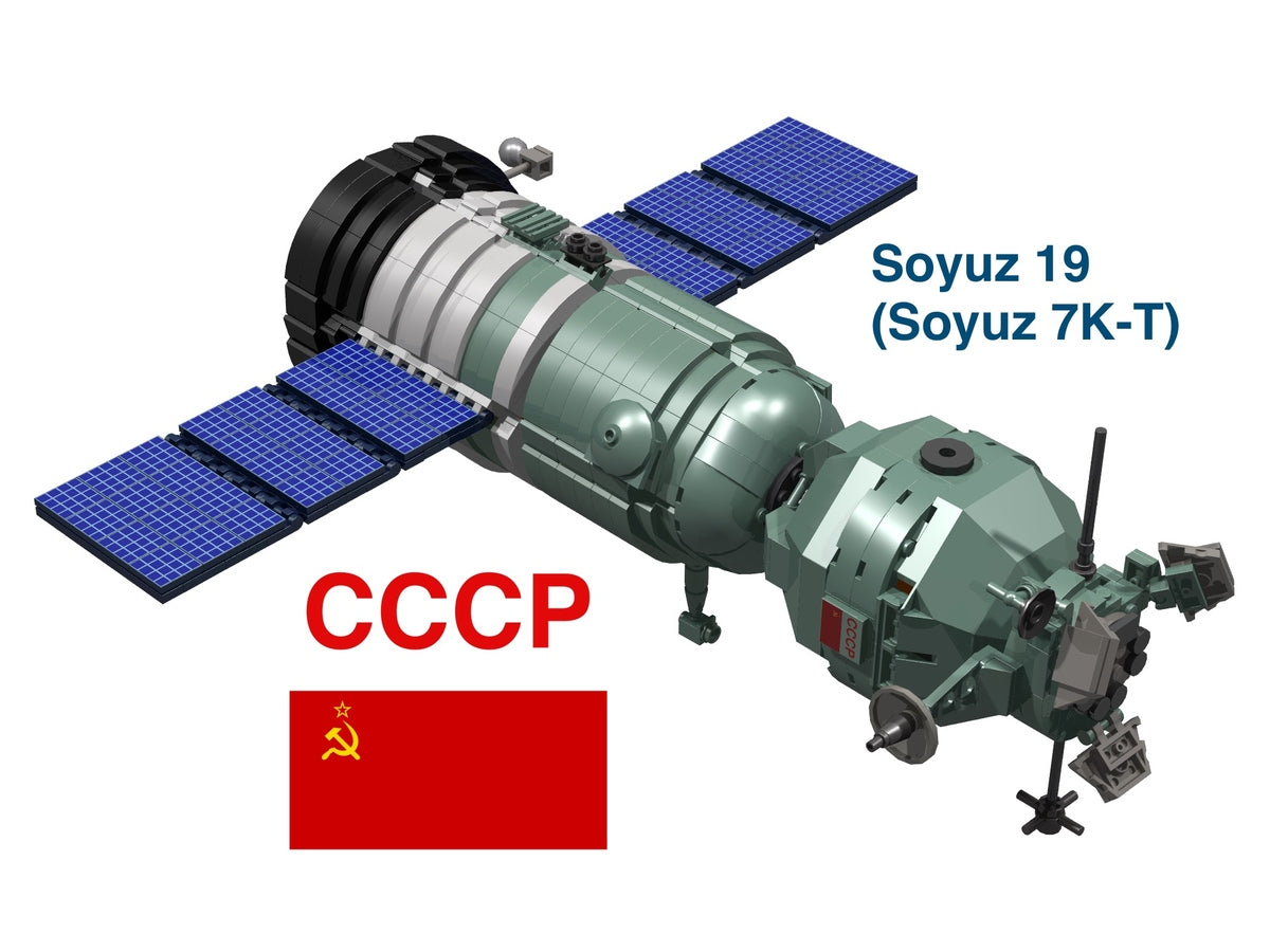 Soyuz 19 spacecraft, variant 7K-T (946 pcs). The 3 modules (orbit, descent, and service) can be separated. The orbit module can be opened and fits 2 minifigs of cosmonauts.