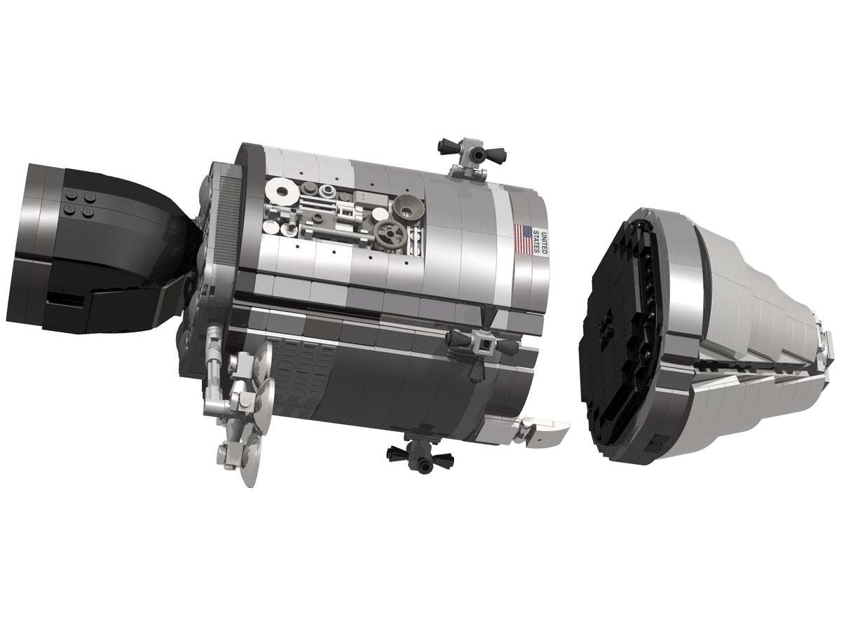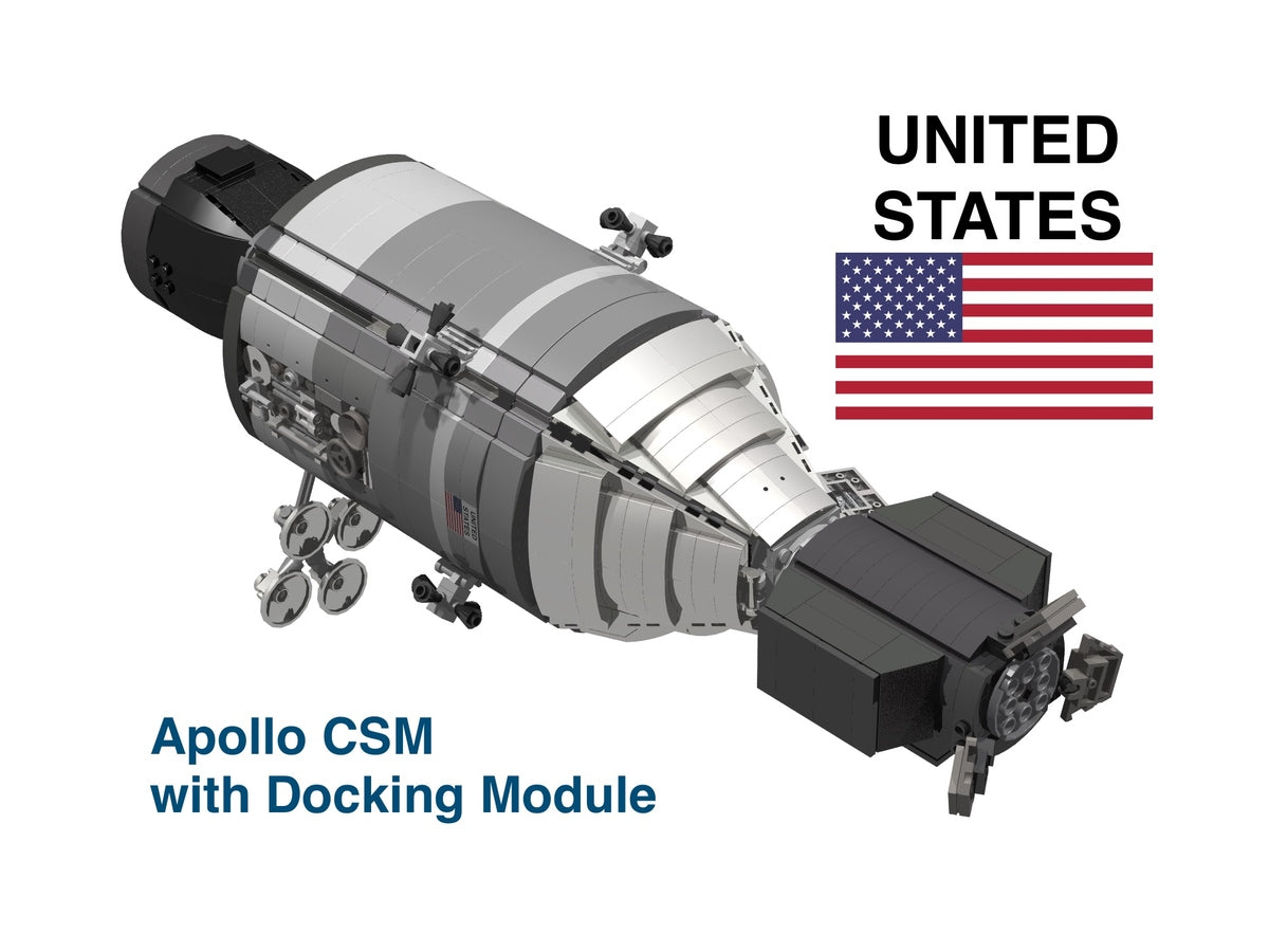 Apollo CSM spacecraft with docking module (993 pcs). Command module can be separated from service module and the docking module. The command module has a hatch and fits 3 astronauts seat in the cabin.