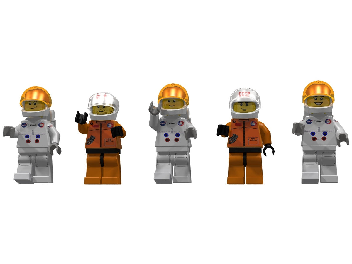 There are 5 minifigs: 3 astronauts and 2 cosmonauts, with custom spacesuits.